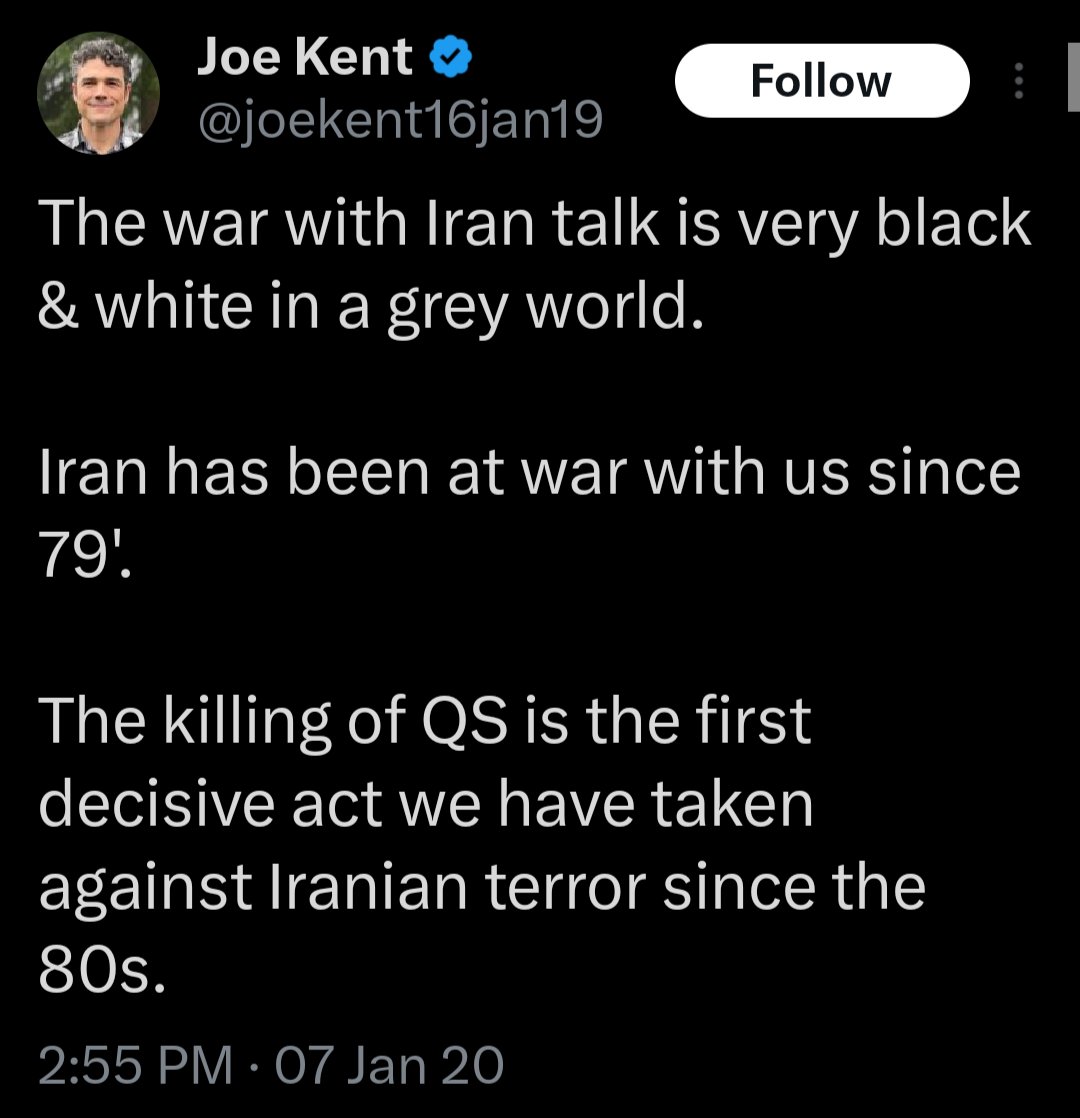 • Another: “Sounds like Barnes is moving the goal posts by labeling Iran's proxies as 'resistance movements. ' lol” It is important to use consistent, objective definitions for a label like “terrorism”, rather than the subjective whims of calling those you don’t like “terrorists” but excuse the identical conduct by those you support as something else. Terrorism has a long standing broadly understood definition: “the unlawful use of violence against civilians to intimidate societies for politicized objectives.” By that definition, Iran’s support tends to be for rebels who mostly use violence against states or other armed rivals — e.g., the Houthis, Hezbollah and the Shia Militias in Iraq. By contrast, they fought ISIS more than we did. By our own State Department, more terrorism happens by Israel and US backed groups than by Iran. Pretending otherwise makes the Iran critics look hypocritical and fraudulent. Equally, and more importantly for American security interests, it makes Iran’s government not an imminent threat to Americans in our own homeland. As is, even if it did, the war creates far more terrorists who will target America.