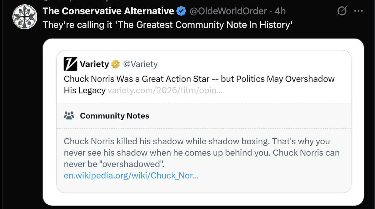 3. Memeatic magic from the OG. https://vivabarneslaw.locals.com/post/7784089/in-honor-of-chuck-norris