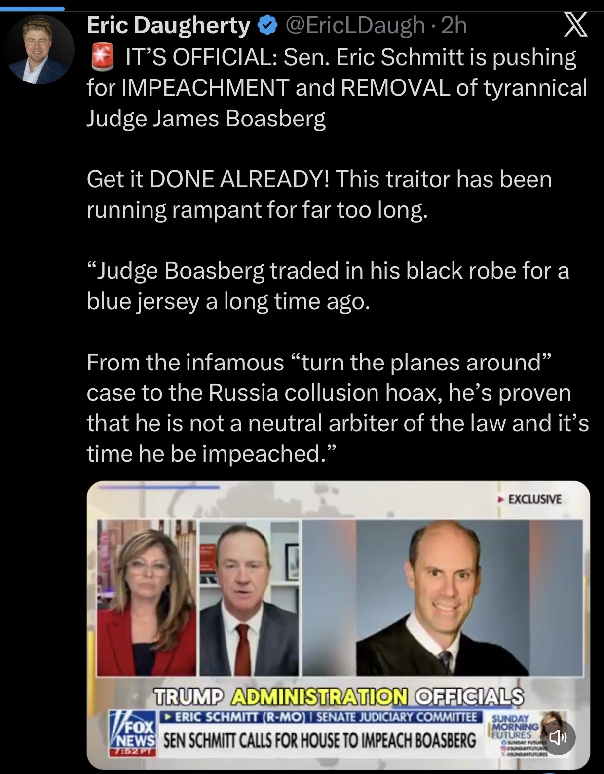 Watch Senator Eric Schmitt as he describes the many reasons why Judge Boasberg must be impeached!