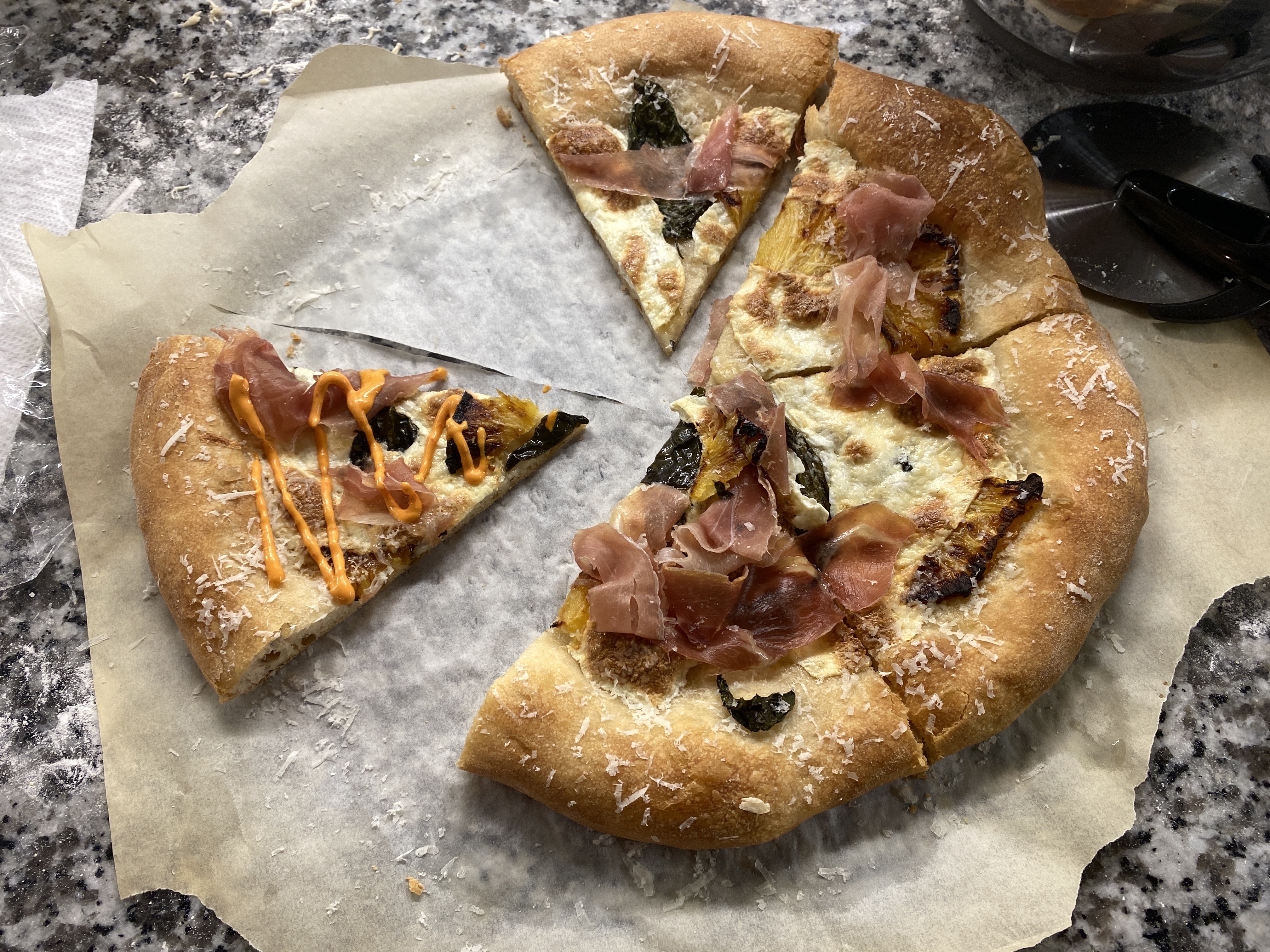 Pineapple, basil, mozzarella, prosciutto, and homemade Calabrian-Mayo Pizza.