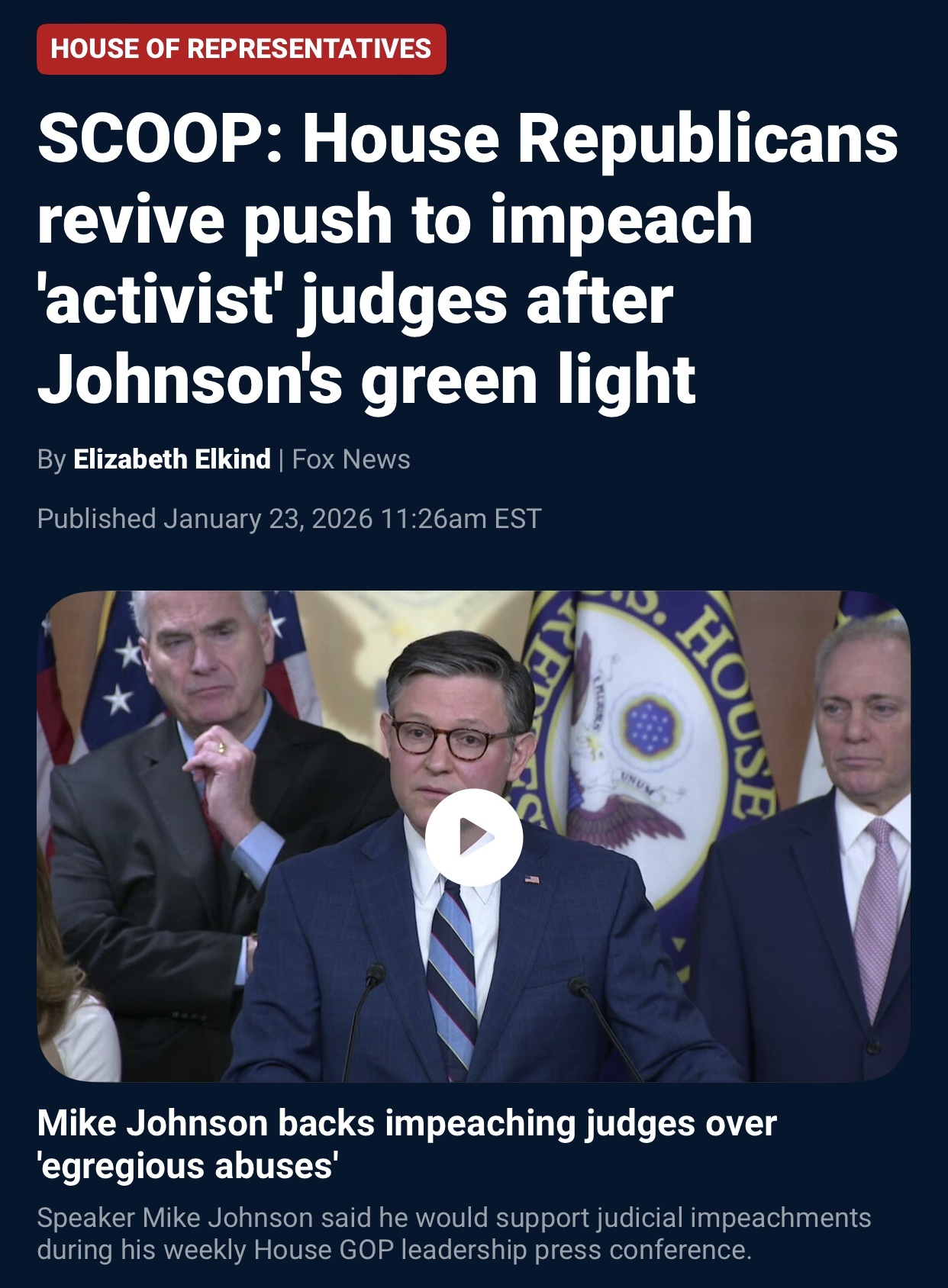 “FIRST ON FOX: House conservatives are reviving various pushes to impeach judges accused of blocking President Donald Trump's agenda after Speaker Mike Johnson, R-La., gave his tacit approval earlier this week.