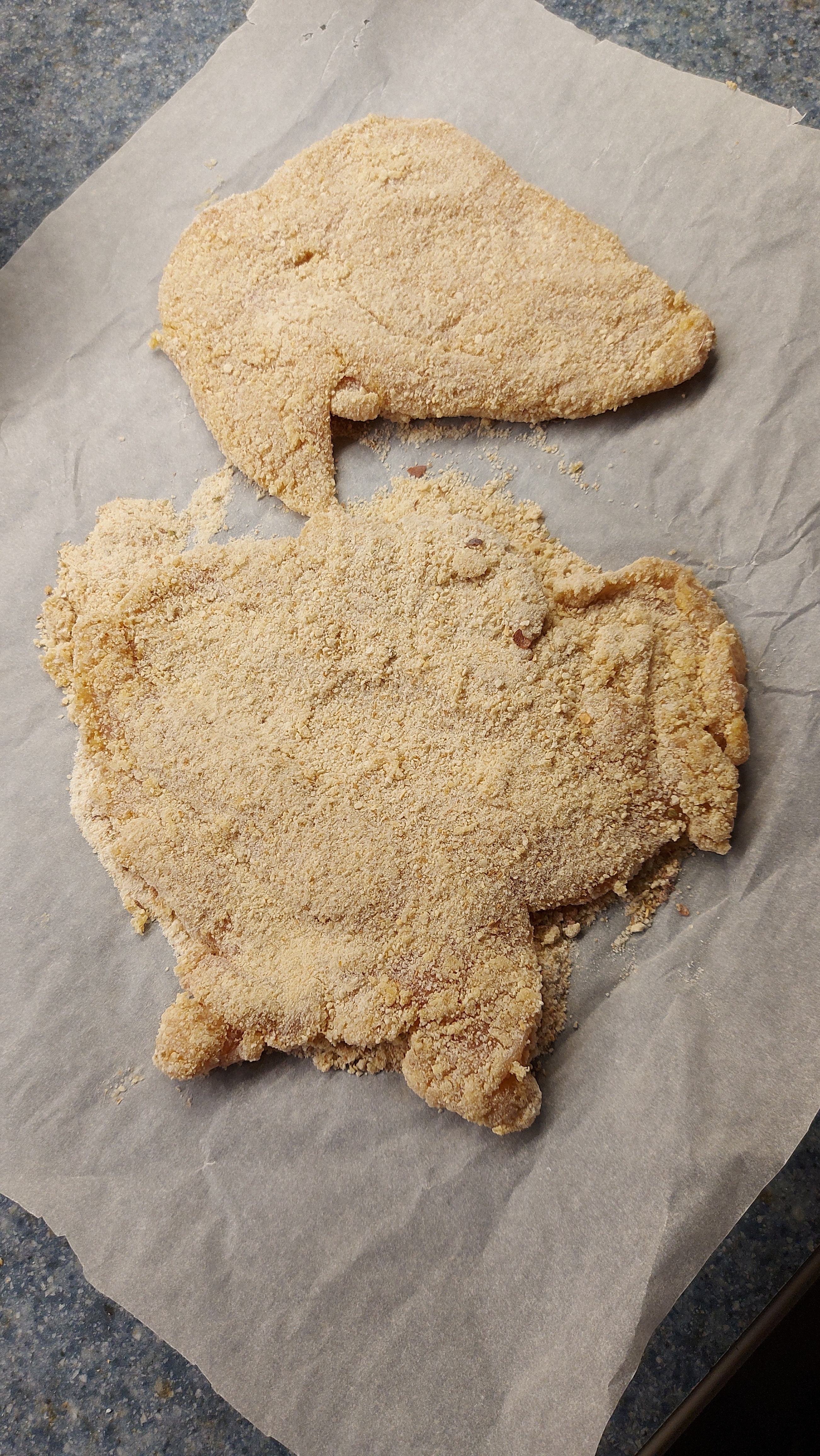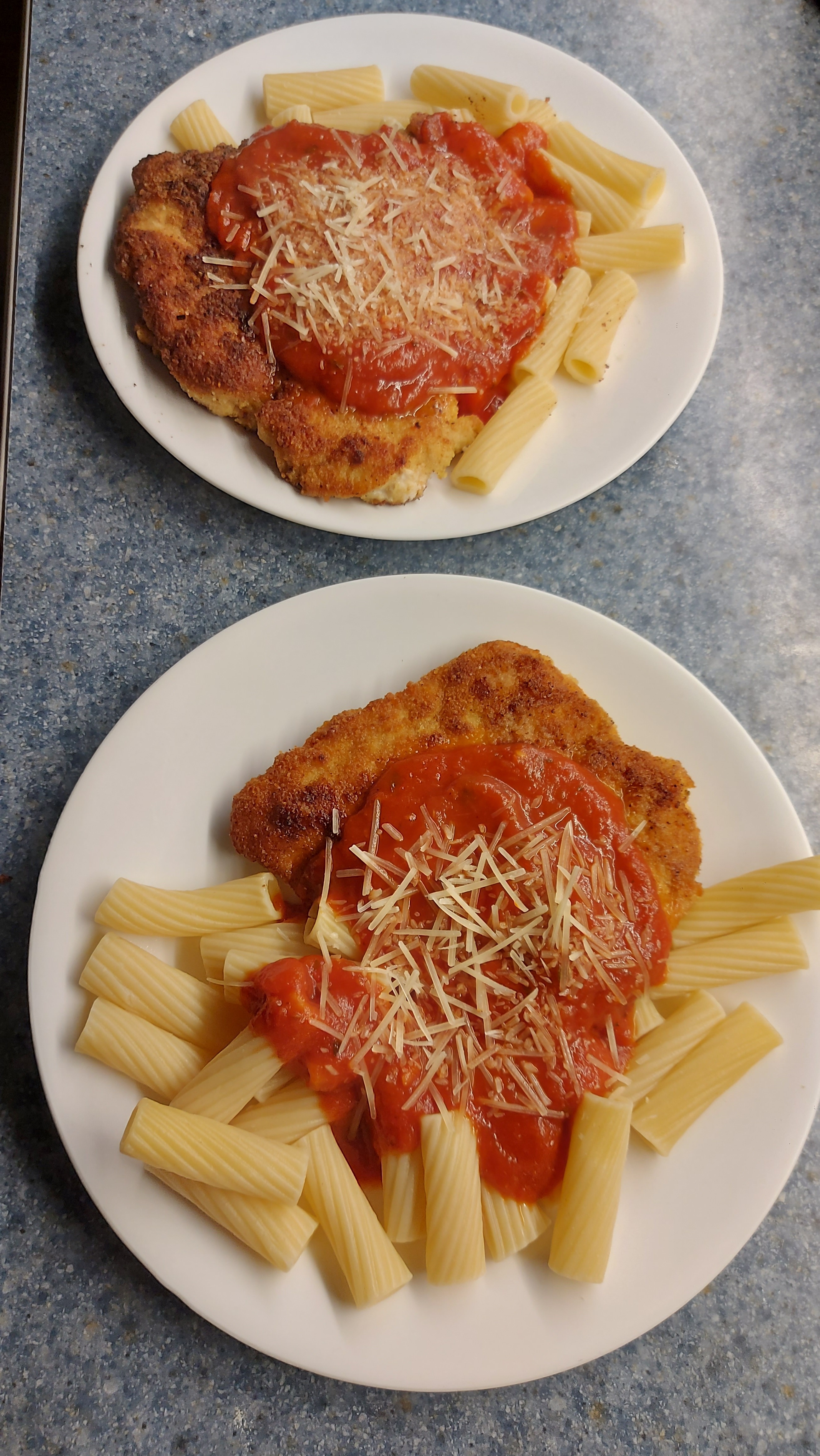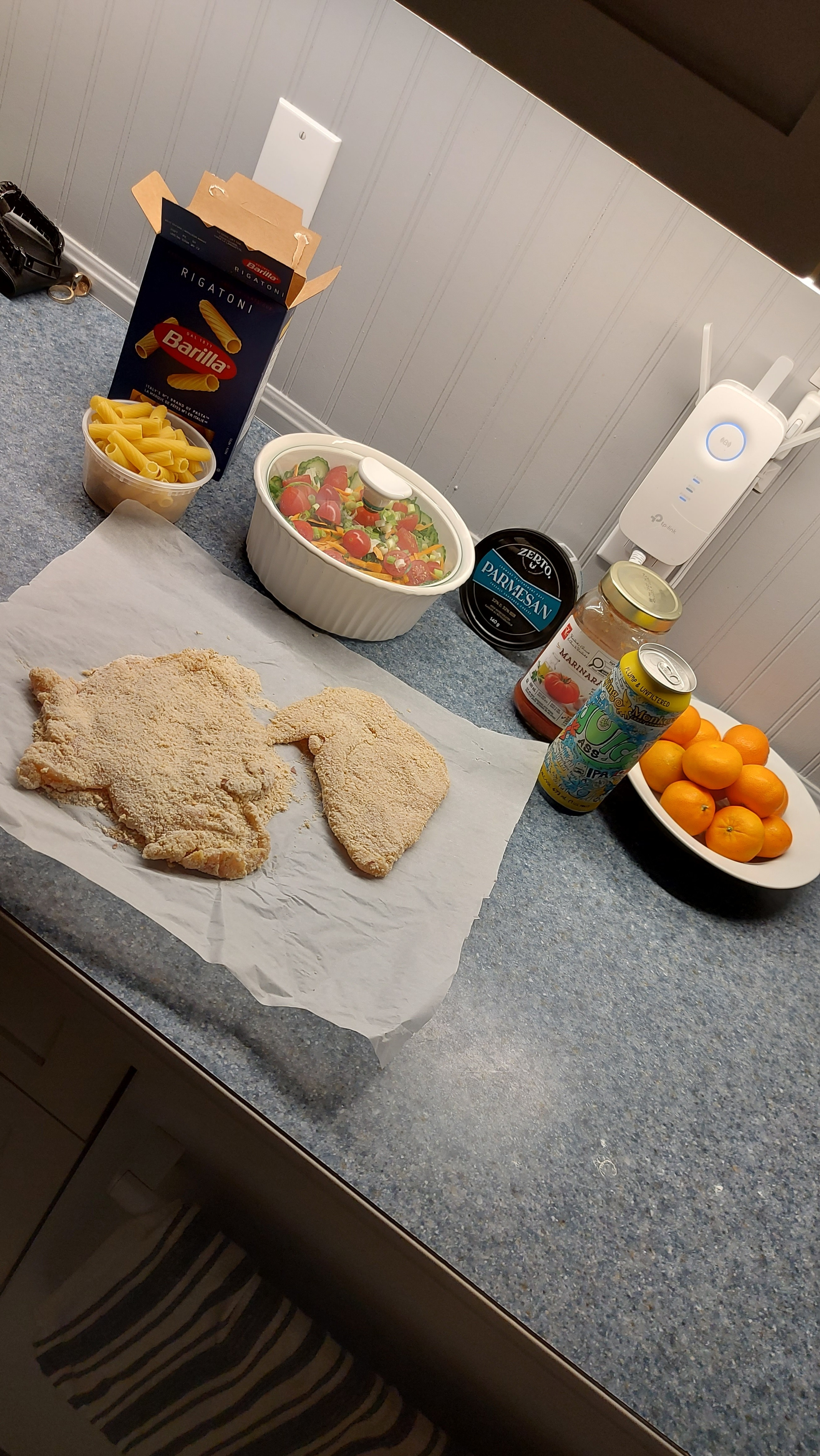 I butterfly a chicken breast. 3 stages. Dip in flour, dip in egg-wash, dip in breadcrumbs. Easy! I always add some Oregano, chilli, onion & garlic powders to the flour mix. 😉 pick your pasta, then your marinara. I also make a salad. Clean your pallette. ! Enjoy. !