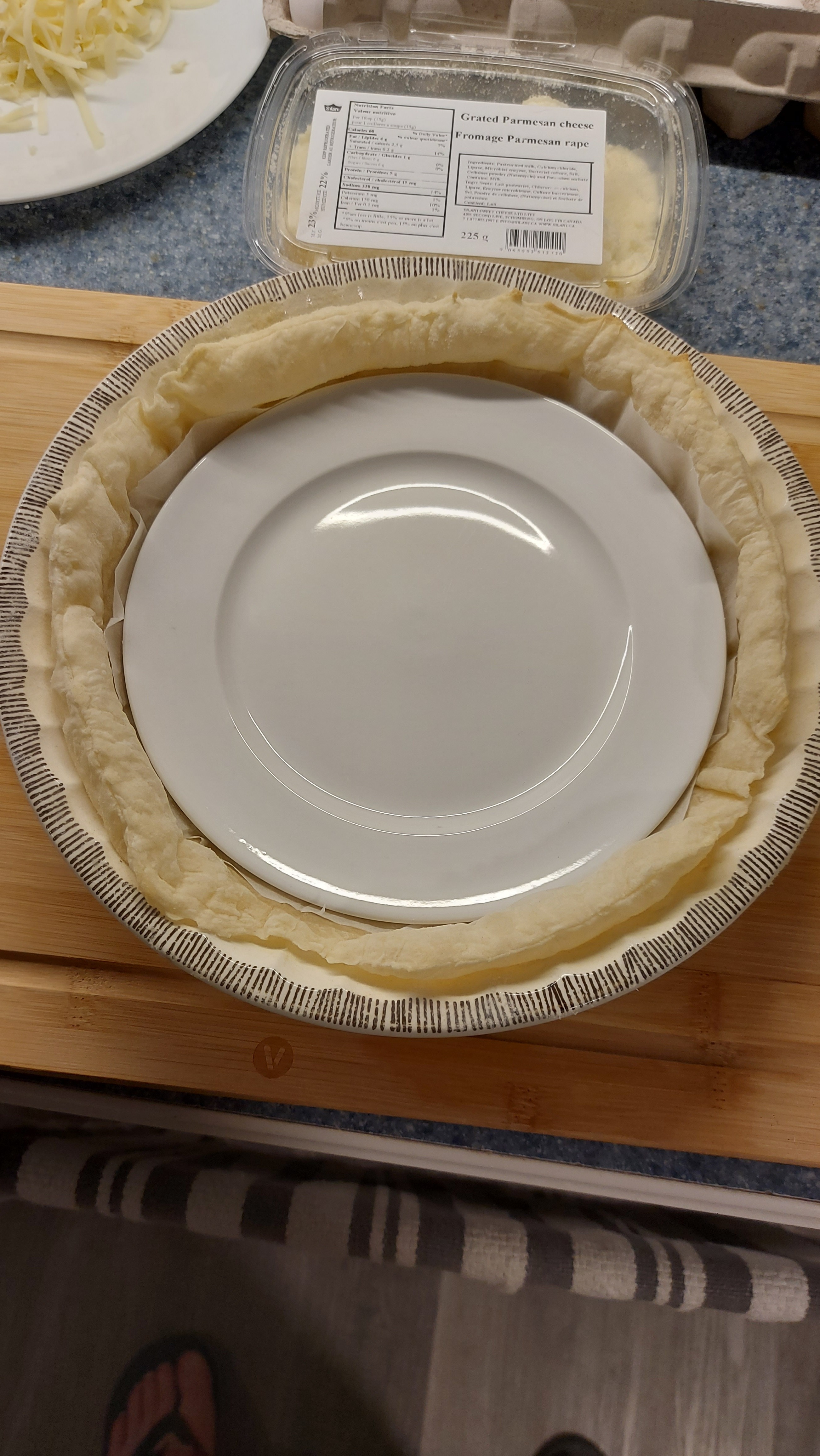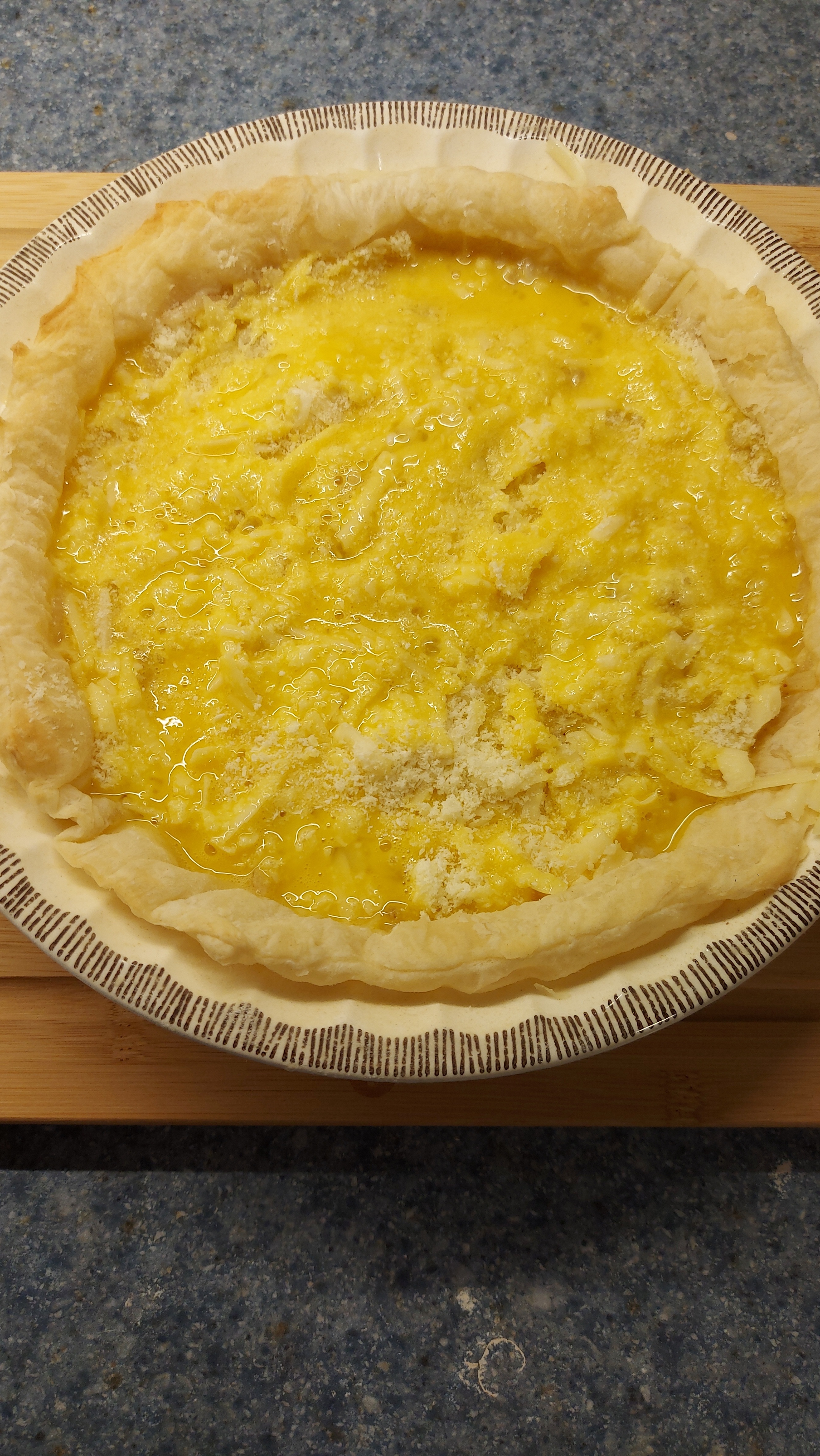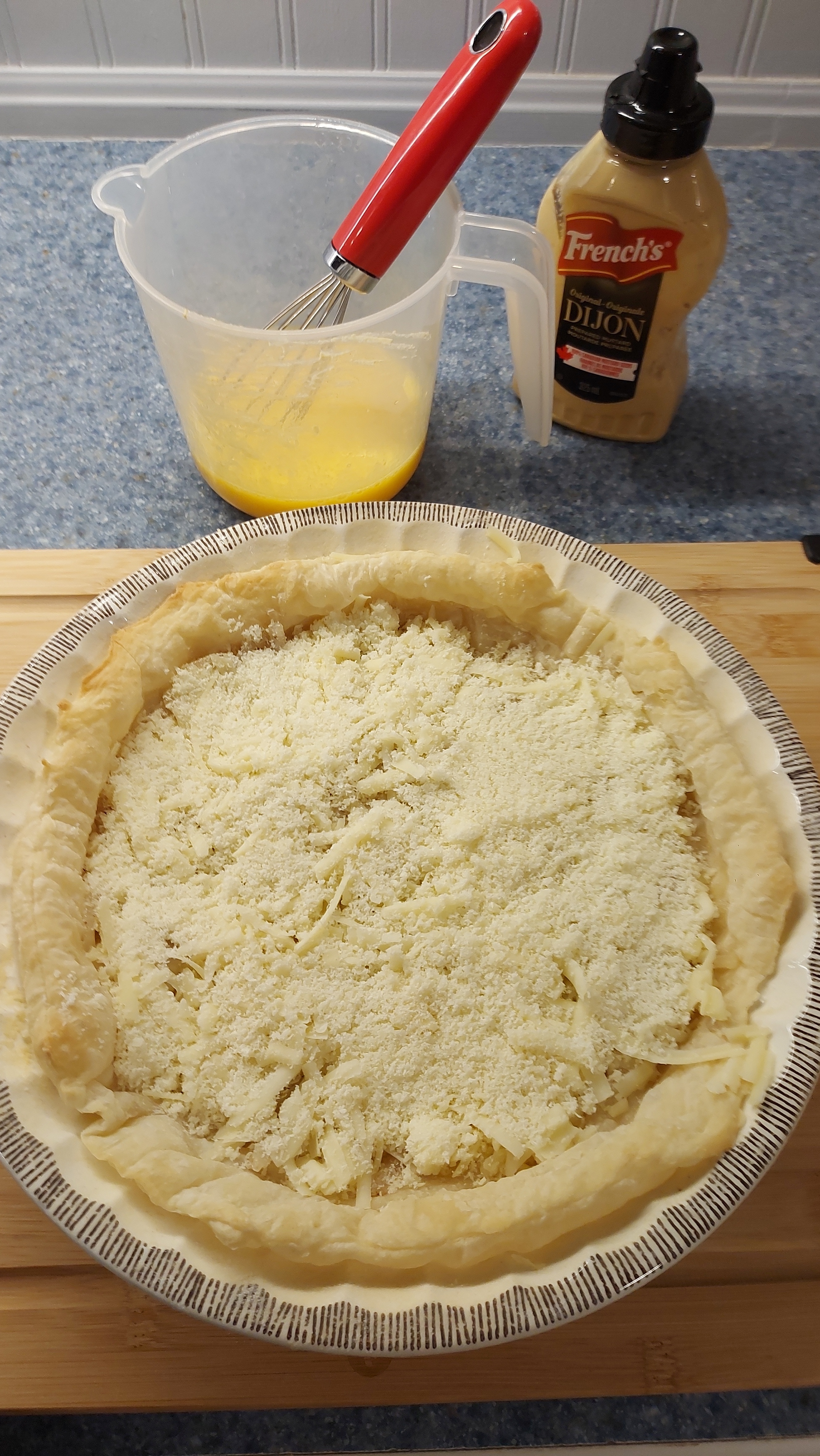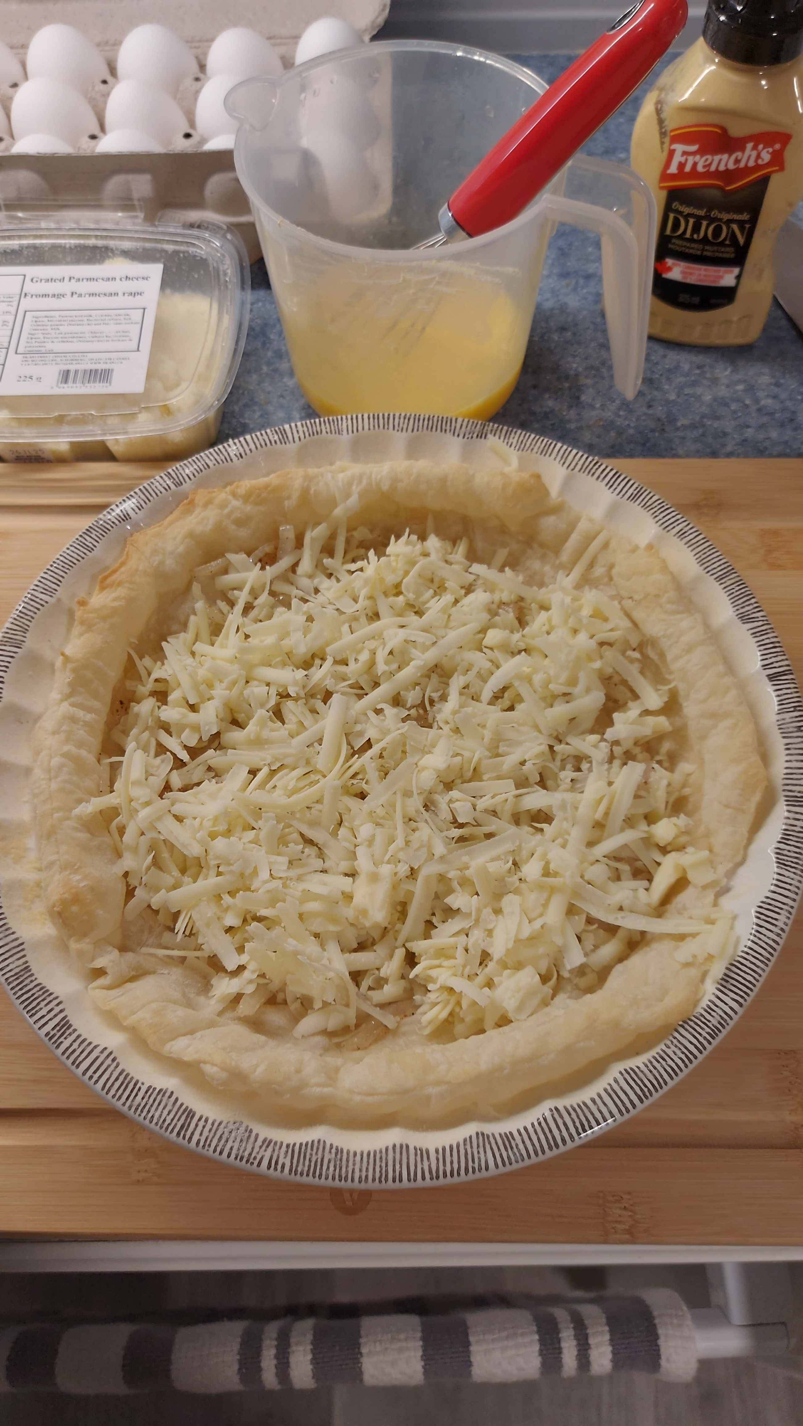 Once your pastry is half baked, line with cheese Onions, and more cheese. Mixed your eggs, add cream, add Parmigiana and pour over cheese + onions..