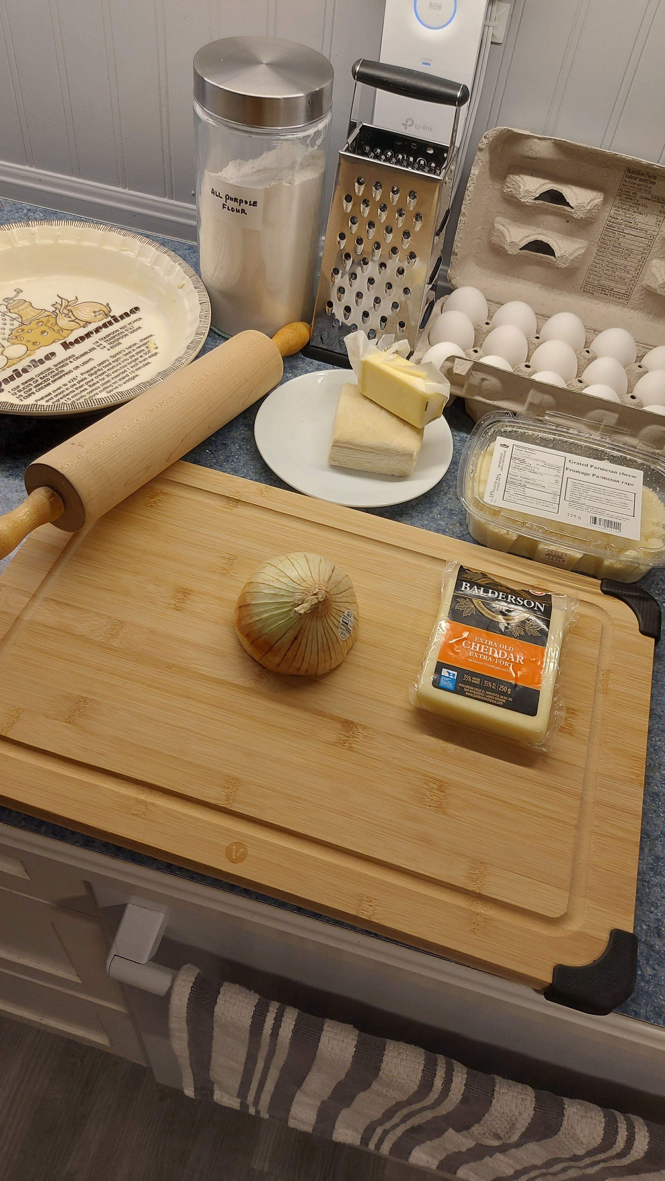 I used a ready made pastry, cos i had it ! 😉 Other than that, you need cream, eggs, cheese and Onions, easy. I used some nutmeg, salt and pepper for flavour. I used a sharp olde cheddar + Parmigiana cheese 🧀. My onion i fried for a few mins in butter.
