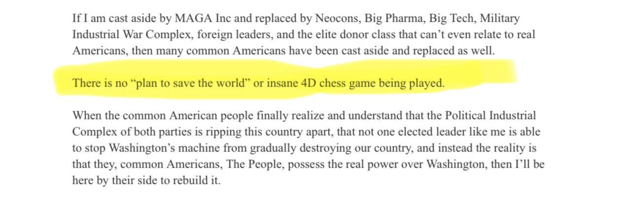 “…There is no “plan to save the world” or insane 4D Chess game being played…”