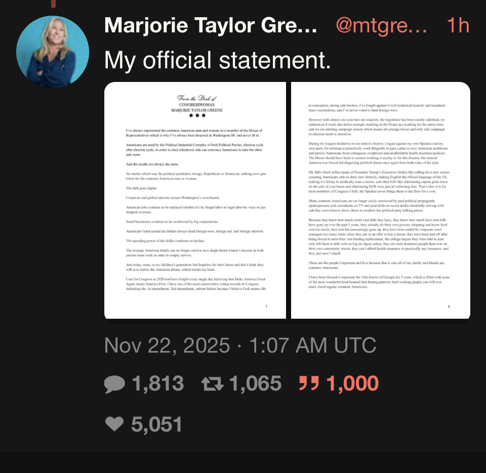 It's official, the neocon retards have won. MTG is resigning from the Congress. Total blackpill. https://x.com/mtgreenee/status/1992035608387039359