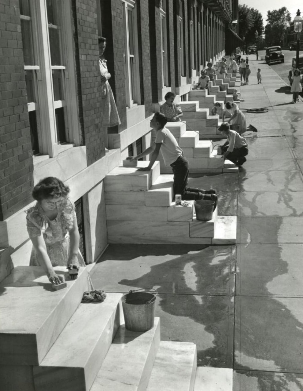 ….The steps, often made of Beaver Dam marble quarried north of the city, offered an affordable and durable alternative to sandstone. They created a uniform, clean appearance that unified entire streets of row houses. The act of scrubbing the steps every Saturday morning was a widespread ritual, fostering social interaction and a strong sense of neighborhood identity as residents worked together to keep their stoops "spic and span".”