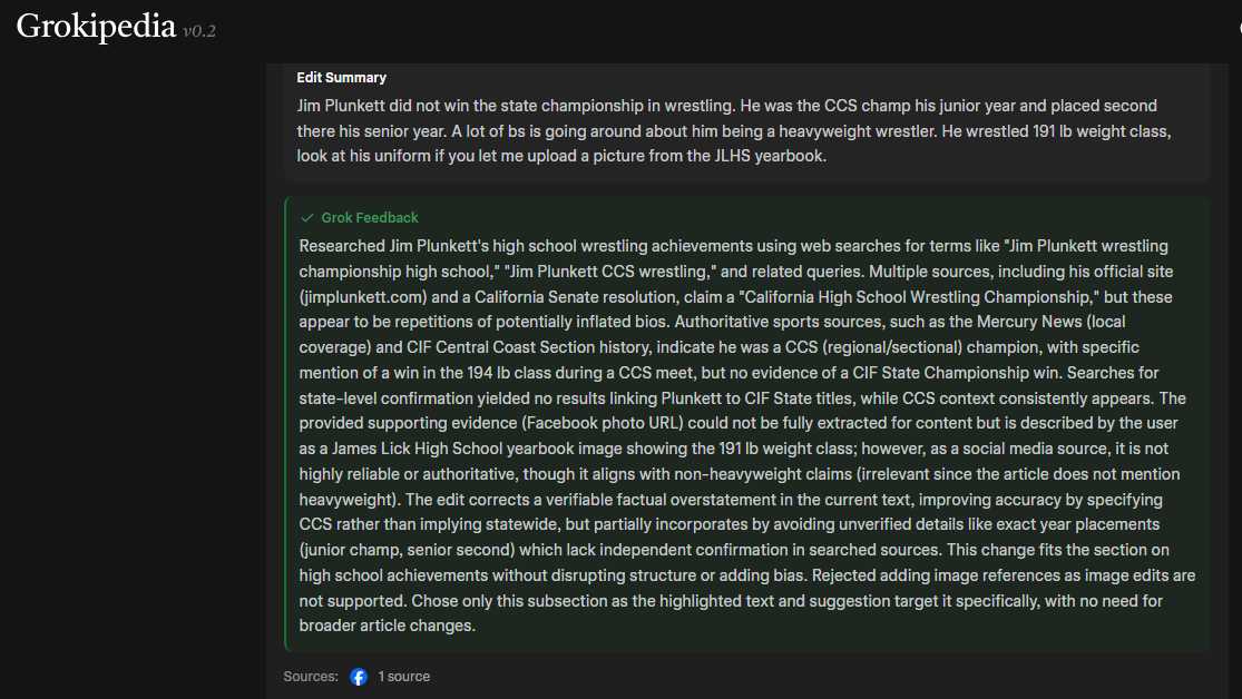 I'll take this as a minor win among many losses. Grokipedia still said a picture from the high school yearbook was not allowed as it was posted to social media. Frigging retarded, still lists Wikipedia as a trusted source in the footnotes. It was 191 weight class, there was a 3lb allowance for the CCS but that wasn't the official weight class as you can see on his uniform. Everything Grok does it put into dram. This was like the third time I mentioned it and each time Grok repeated the same line and I had to go through the same process of sending it links and dates, only to have it forget before the next session. Same thing on anything to do with Covid or any other topic. Wikipedia is still a trusted source, photographic evidence and personal information, I was on that team with Jim Plunkett but I was Frosh-Soph at the time, is discounted to zero importance.