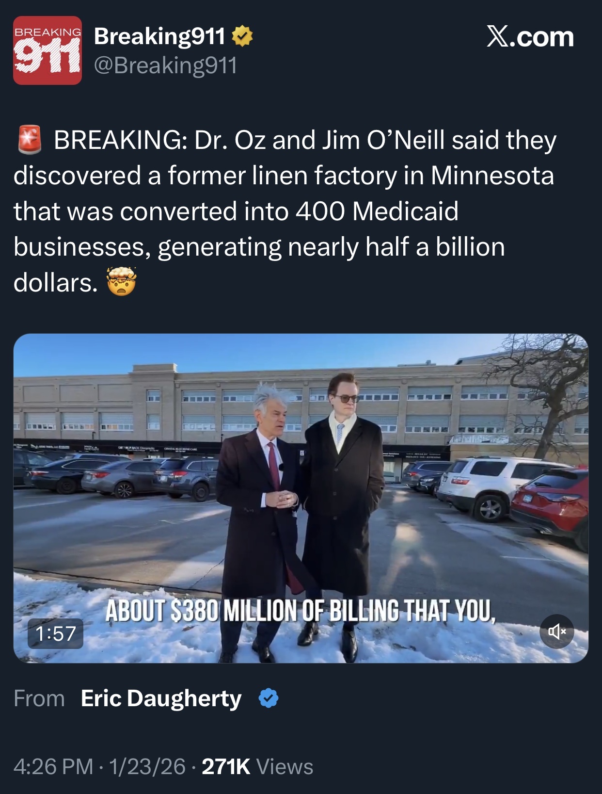 @RobertBarnes @VivaFrei and all. 🚨Watch Dr Oz and Jim O’Neill in Minnesota outside a building that was a linen factory but is now 400 fake Medicaid businesses that stole approximately $400 million of taxpayer dollars.