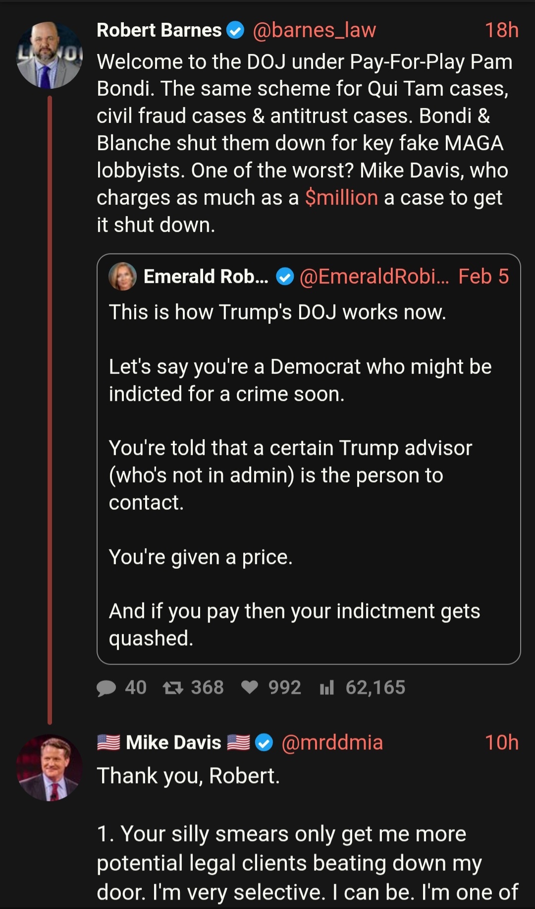 If Mike Davis is taking Bribes to "fix" things, for people willing to pay him to do that in legal cases~ how does this get legally exposed & HOW the hell does Davis, Bondi, Blanche & whoever else is involved get OUTED & HELD ACCOUNTABLE? 🤷‍♀️ NOW!