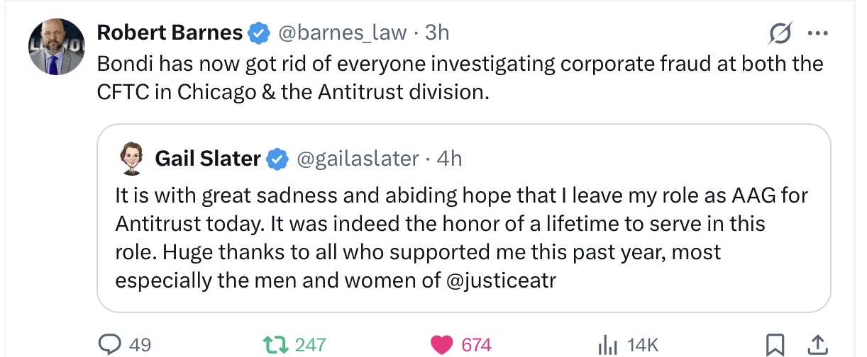***Bonus: Bondi burying cases of corporate corruption. https://www.citizen.org/article/canceled-corporate-enforcement-trump-first-year-second-term/