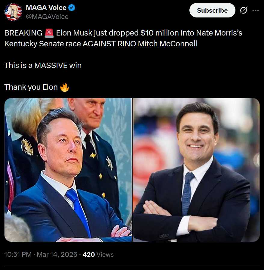 Just In: Elon Musk just dropped $10 million into Nate Morris’s Kentucky Senate race AGAINST RINO Mitch McConnell...
