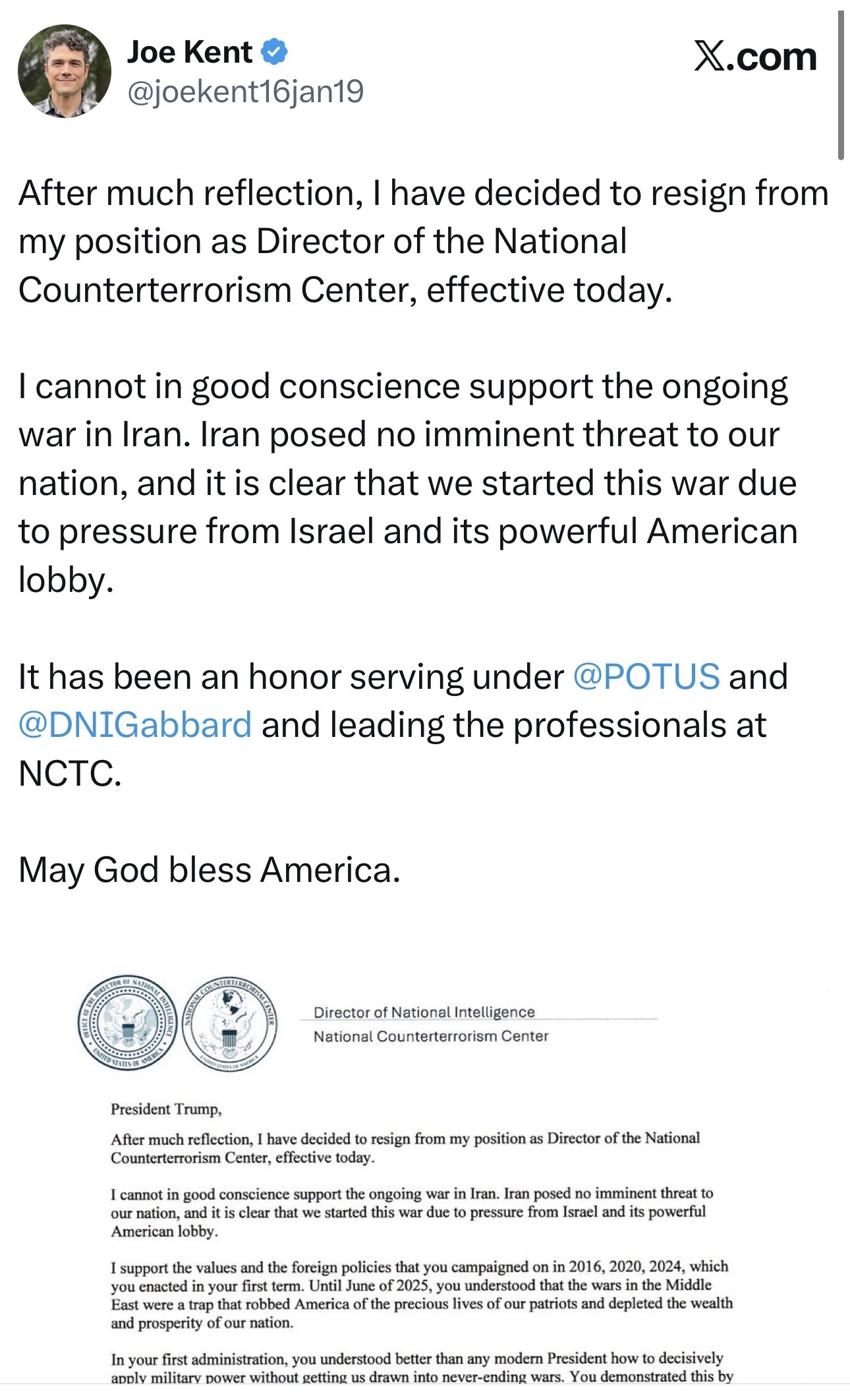 “After much reflection, I have decided to resign from my position as Director of the National Counterterrorism Center, effective today.