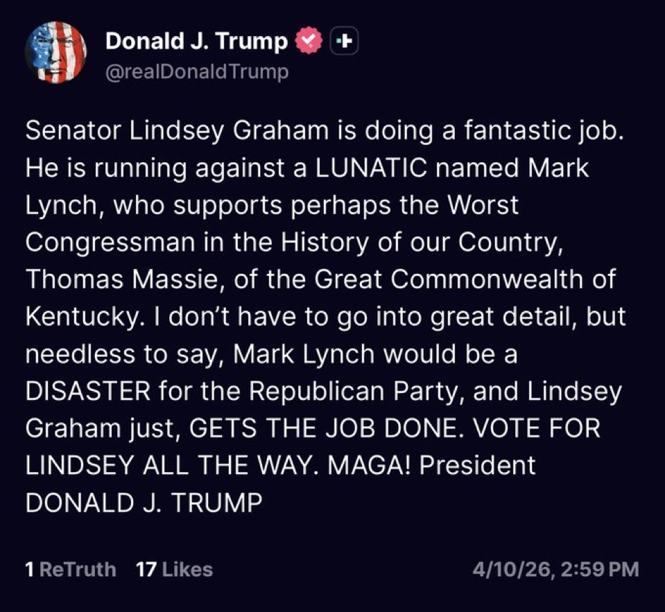 In case you missed it, Paul Dans dropped out of the South Carolina senate race and the orange traitor gave Lindsey Graham yet another endorsement. I don’t live in South Carolina, but I did, I’m noting voting for that piece of shit. I’m not voting at all in 2026. Trump made his bed and he can lie in it. At this point, I hope Lindsey Graham votes to convict. Trump deserves it