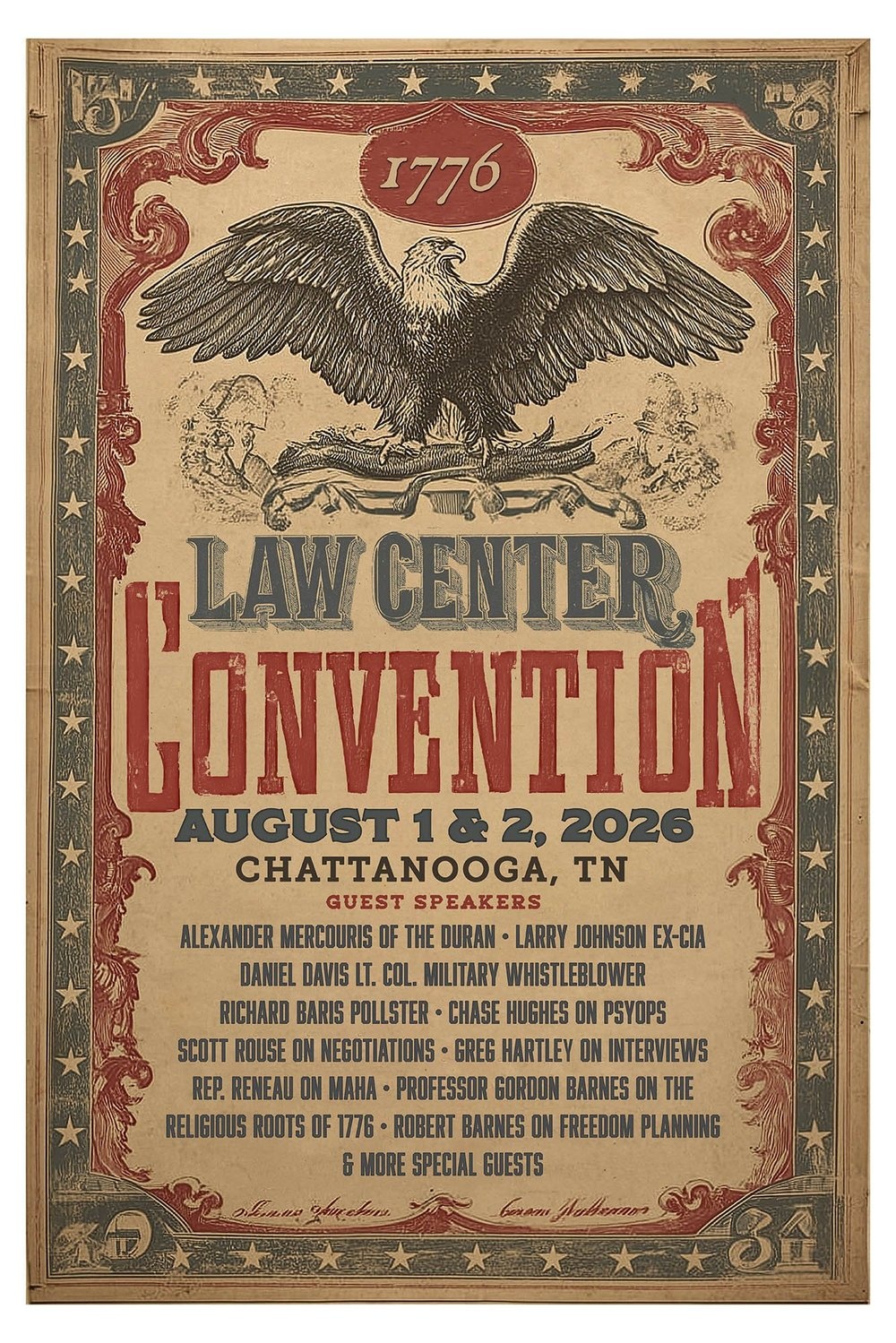 250th American Anniversary & 2nd Annual 1776 Law Center Conference Fundraiser in Chattanooga, Tennessee on August 1 & 2. Schedule designed so people can arrive Saturday & depart Sunday to limit lodging costs if they choose. Over a dozen hours of exclusive content from a dozen guest speakers. Food catered in for the event. Limited space available: 1776lawcenter.com